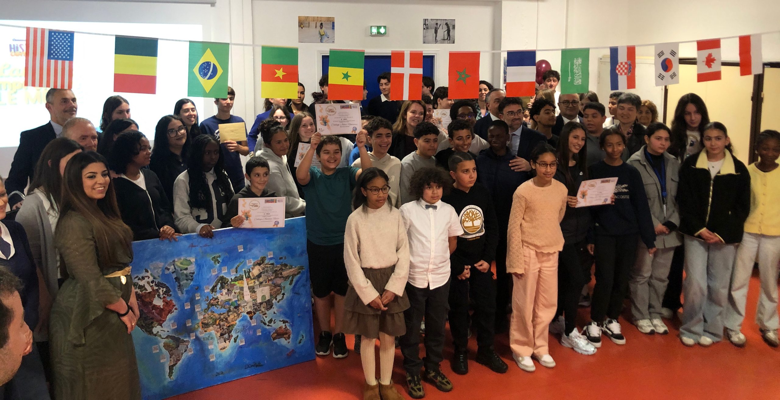 Une immense toile représentant le Monde constitue l’œuvre artistique collective accompagnée de QR codes permettant aux élèves de se présenter dans différentes langues et de partager un mot qui leur tient à cœur.