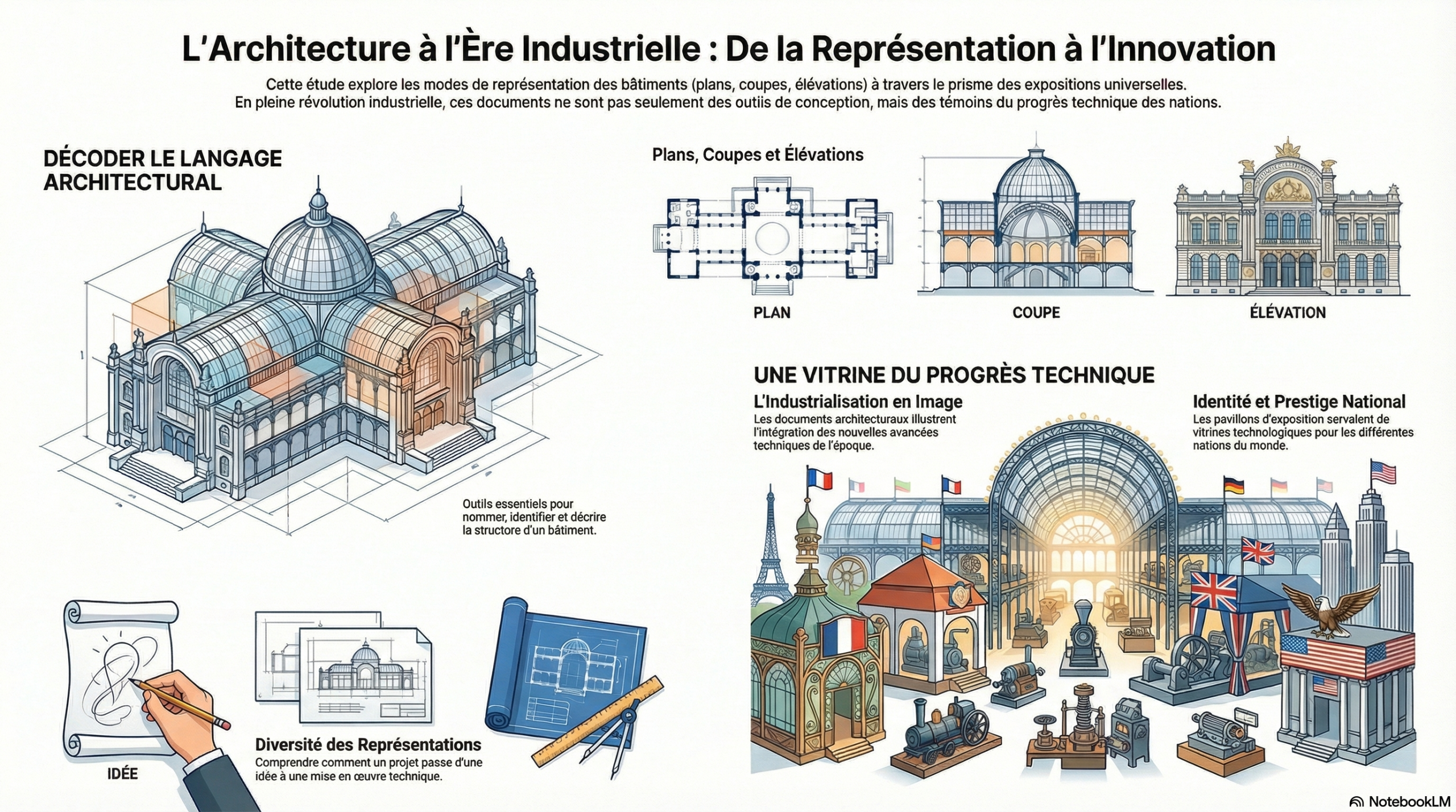 L’étude des expositions est l’occasion en classe de sensibiliser les élèves à la diversité des modes de représentation de l’architecture en les invitant à nommer, identifier puis décrire les coupes, plans, élévations des principaux pavillons. En pleine révolution industrielle, ces documents sont aussi des vitrines techniques pour les différentes nations.