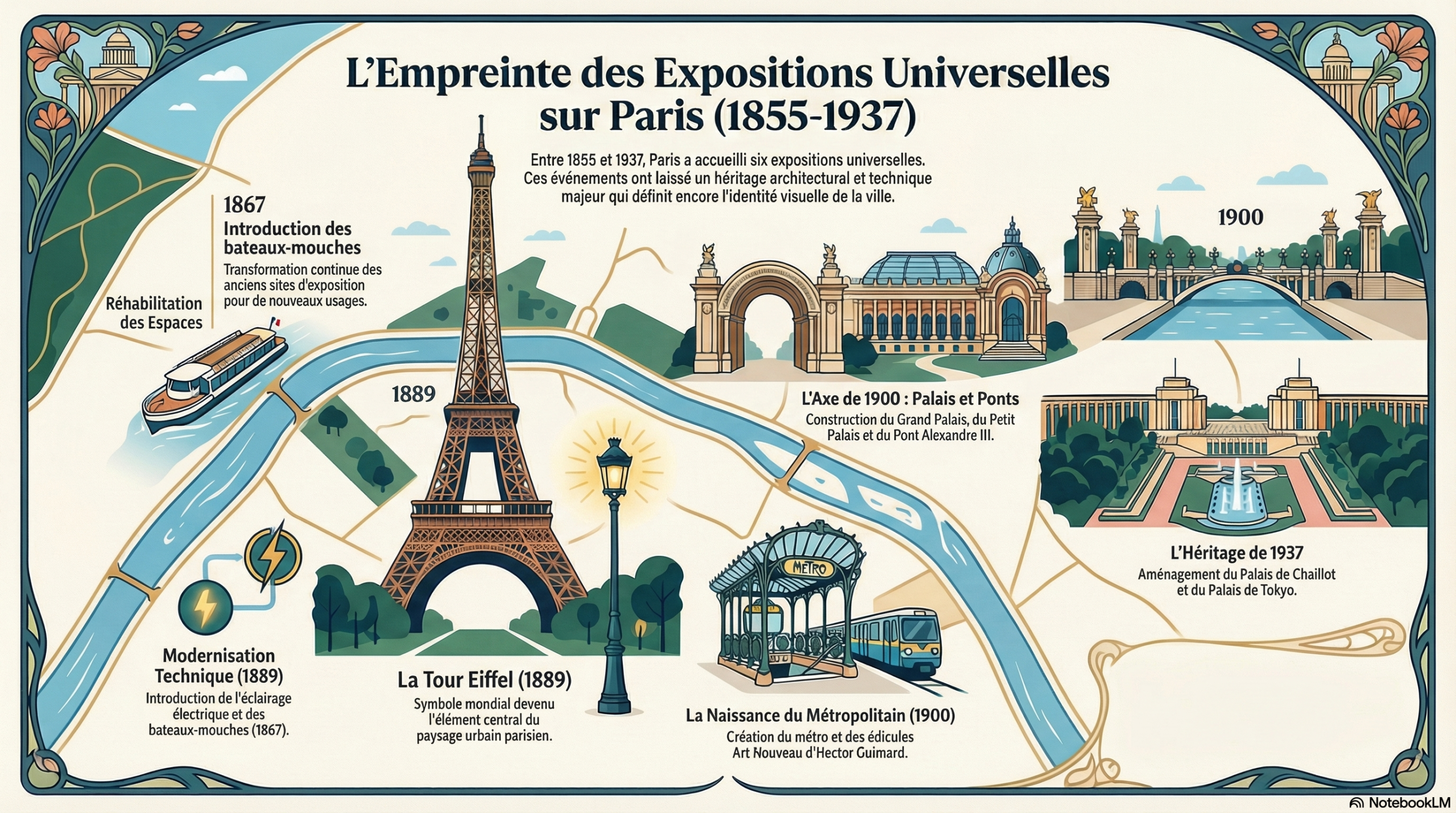 _ Des bateaux-mouches en 1867, l’éclairage électrique en 1889 au métro et édicules Art Nouveau d’Hector Guimard en 1900, les monuments comme la Tour Eiffel, les Grand et Petit palais, le pont Alexandre III, le palais de Chaillot et de Tokyo sont des héritages de ces manifestations ;