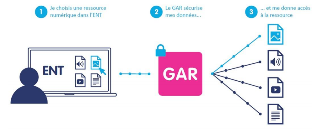 Le GAR est un service d’accès aux ressources numériques depuis l’espace numérique de travail (ENT). Il facilite l’accès aux ressources numériques et garantit la protection des données à caractère personnel des élèves et des enseignants. Le GAR agit tel un filtre sécurisant en contrôlant les données à caractère personnel qui sont échangées entre les utilisateurs des établissements scolaires et les fournisseurs de ressources.